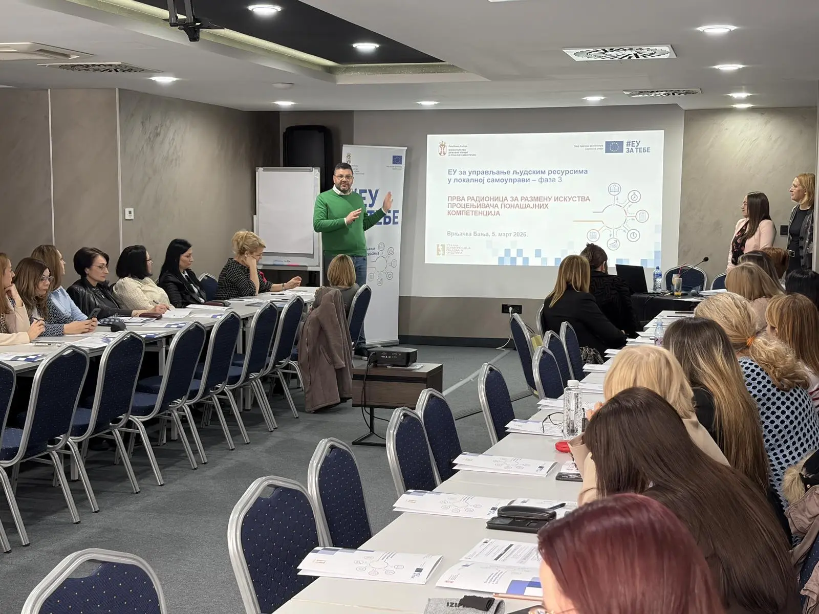 Дана 5.марта 2026. године Стална конференција градова и општина, у сарадњи са Службом са управљање кадровима, организовала је једнодневну радионицу под називом „Први састанак за размену искуства процењивача понашајних компетенција“ у Врњачкој бањи, коју финанцира пројекат „ЕУ за управљање људским ресурсима у локалној самоуправи – фаза 3“. Представнице Службе које су држале ову обуку су Јована Стојадиновић, руководитељка Групе за регрутацију и промоцију државне управе као пожељног послодавца и Александра Станковић, руководитељка Групе за међународну сарадњу и управљање пројектима.